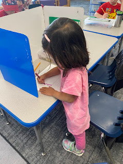 KP students are becoming very independent writers! Everyone sets up their writing area and gets to work right away. We are working on drawing a detailed picture, adding labels & color, and even trying to write a sentence! This week we wrote about places we like to go to. Ask your child what they wrote about!